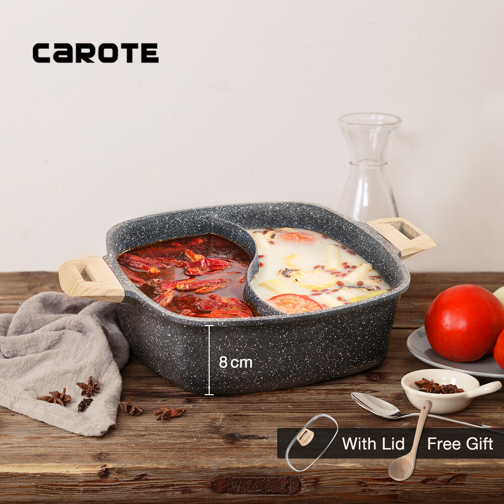 Carote Essential Woody Hotpot with Divider and Lid 28cm two-flavor Pot for Family Dinners Maifan Stone-Derived Nonstick Coating and Wooden Effect handle Suitable for All Stoves including Induction
