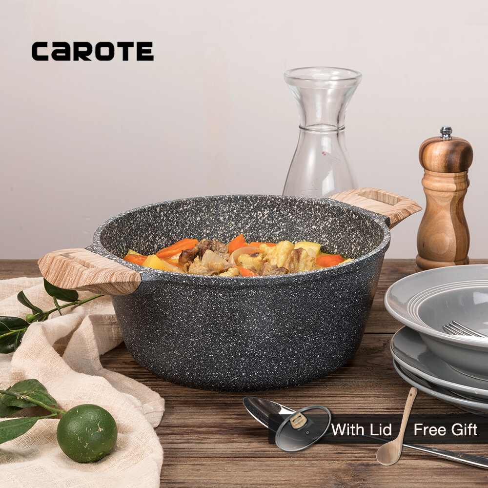 Carote Essential Woody Non-Stick Maifan Stone Coating Die-Cast Casserole PFOA Free Saucepot With LidFree Wooden Ladle Included.