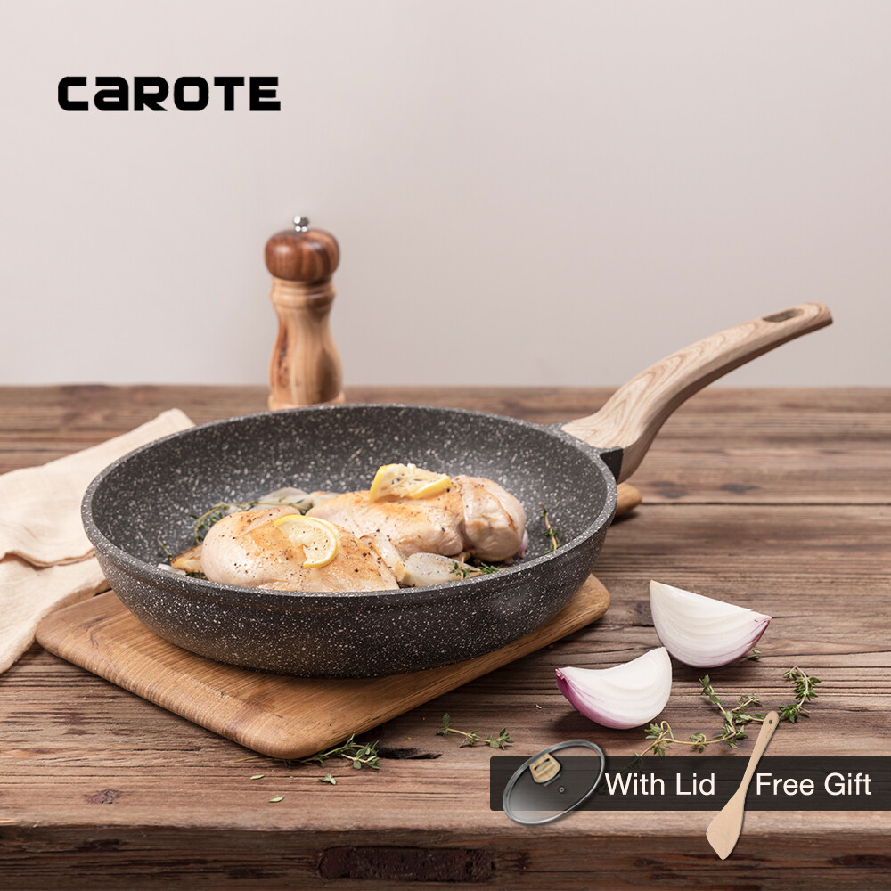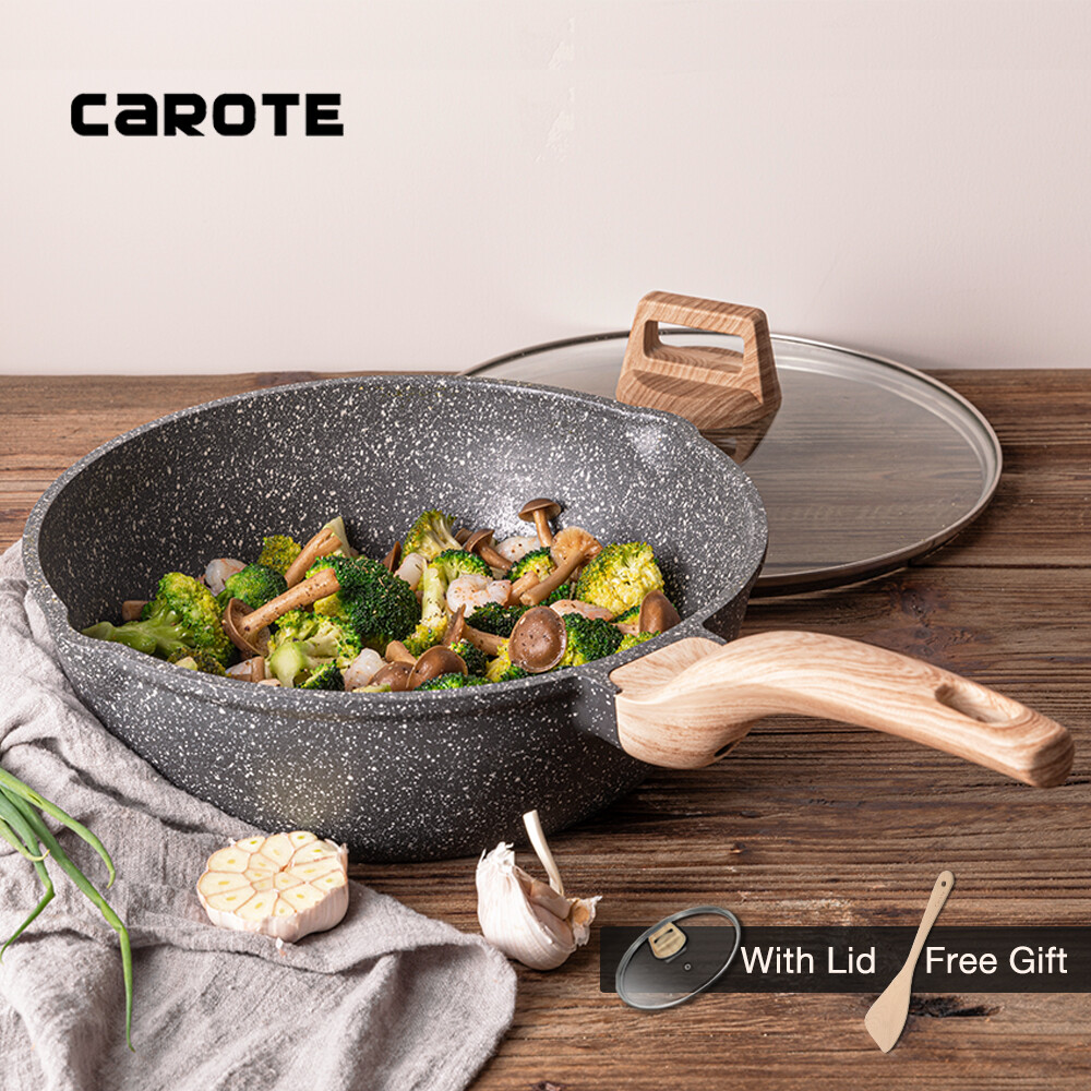 Carote Esssential Woody Non-stick 24/28/30/32cm Deep Fry Pan With Lid Large Capacity Frying Wok Smokeless Die-Cast CookwareNon-Stick Coating Imported From Swizerland Suitable For All Stoves. Free Wooden Ladle Included.