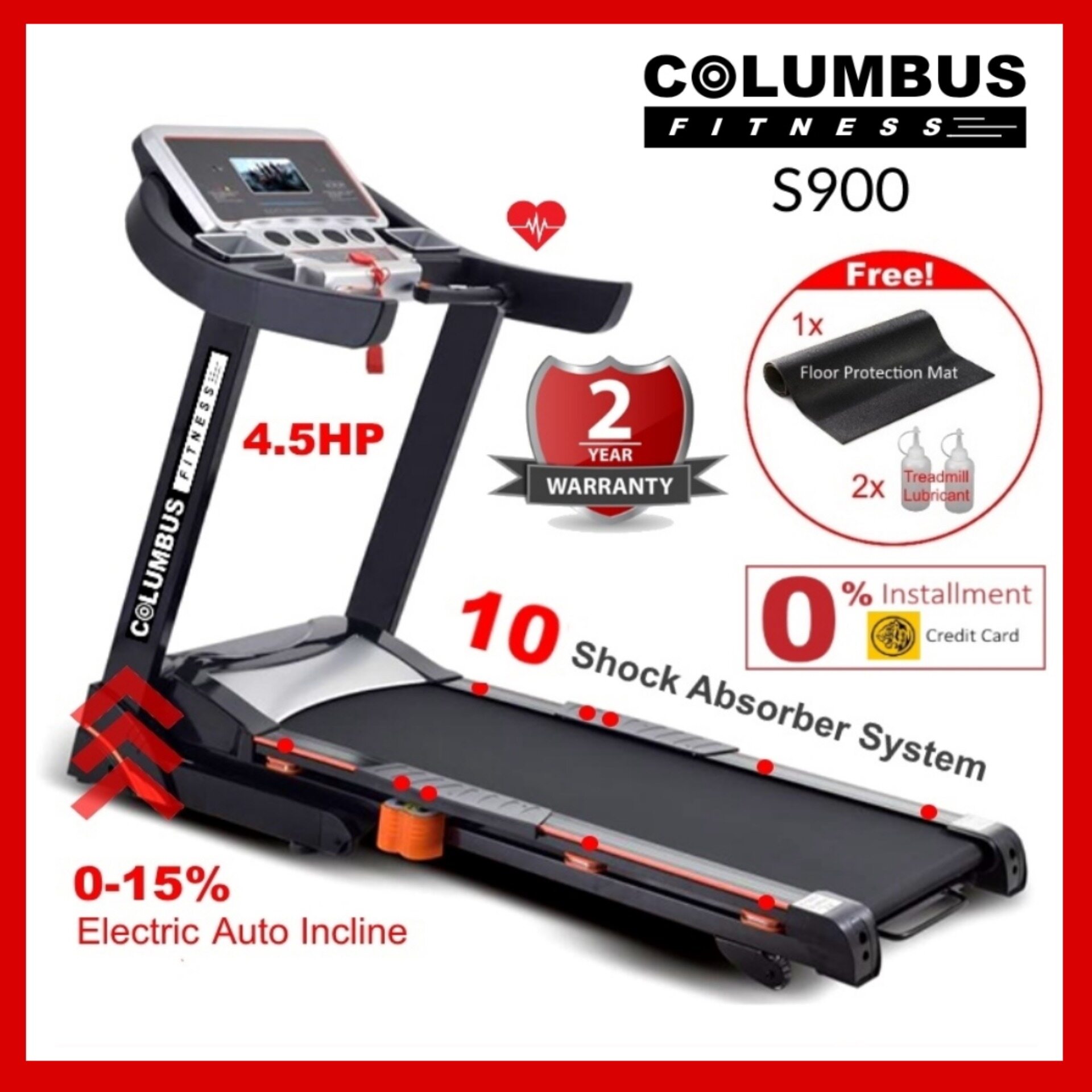 4.5HP Columbus Fitness S900 Professional Treadmill 15 Levels Electric Auto Incline
