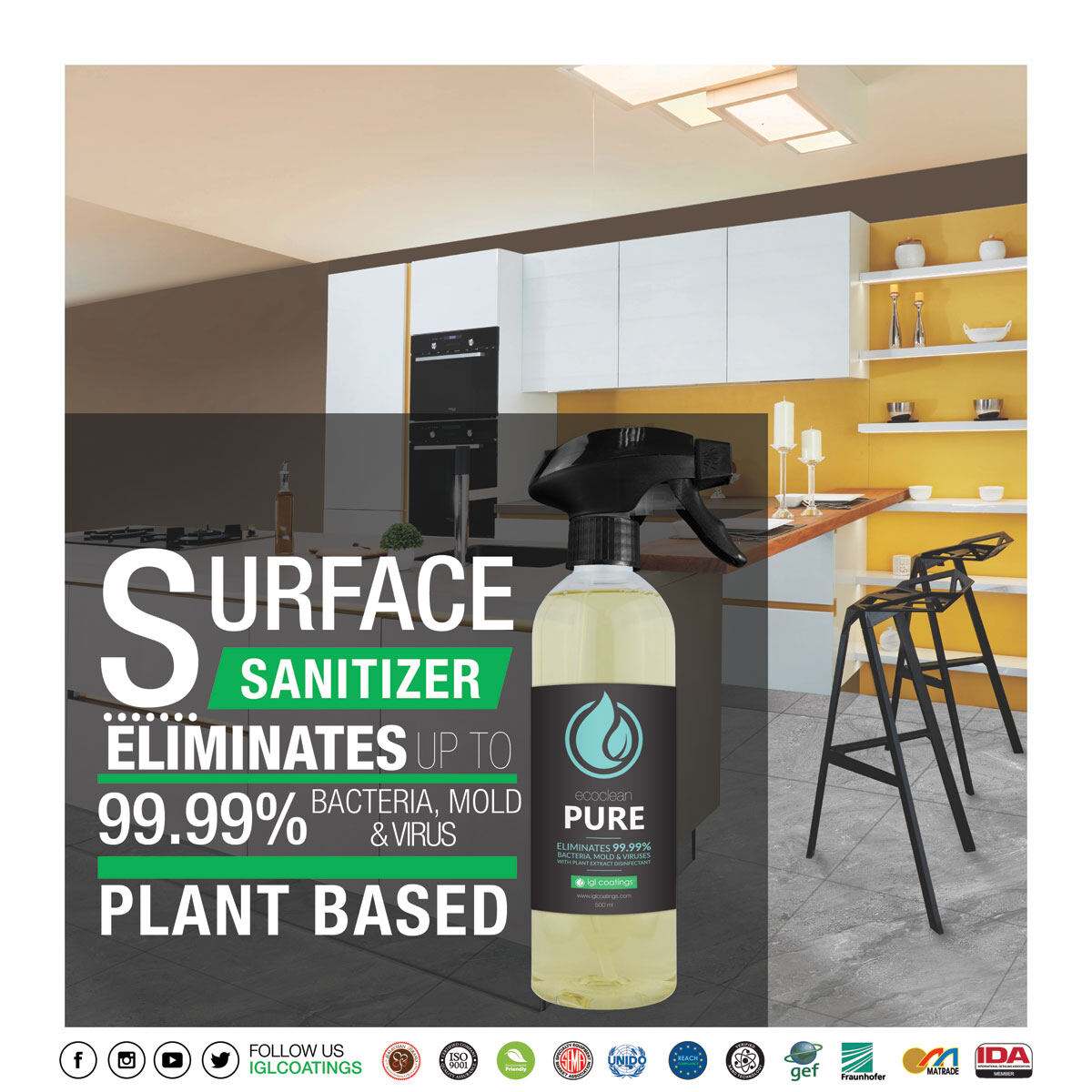 IGL Ecoclean Pure 100ML or 500ML - Multipurpose All Surface Safe Hand Sanitizer Sanitiser Wipe 75% Alcohol Disinfectant Spray (Lab Tested) Eco-friendly Anti Virus, Bacteria, Mould